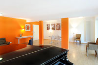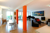 Das modern ausgestattete Haus verfügt über zwei Appartements mit gemeinsamer Küche auf der 1. Etage und eine Zweizimmerwohnung im Dachgeschoss. Im Parterre befindet sich eine schalldichte Übebox, ein großer Gemeinschaftsraum und einer Terrasse, die das Haus zum Garten hin öffnet.