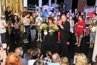 Professorin em. Dr. Dr. h.c. Ursula Hansen mit Konrad Haas und den Darstellenden aus "Himmel Hagel Stern und Blitz" bei der Premiere.